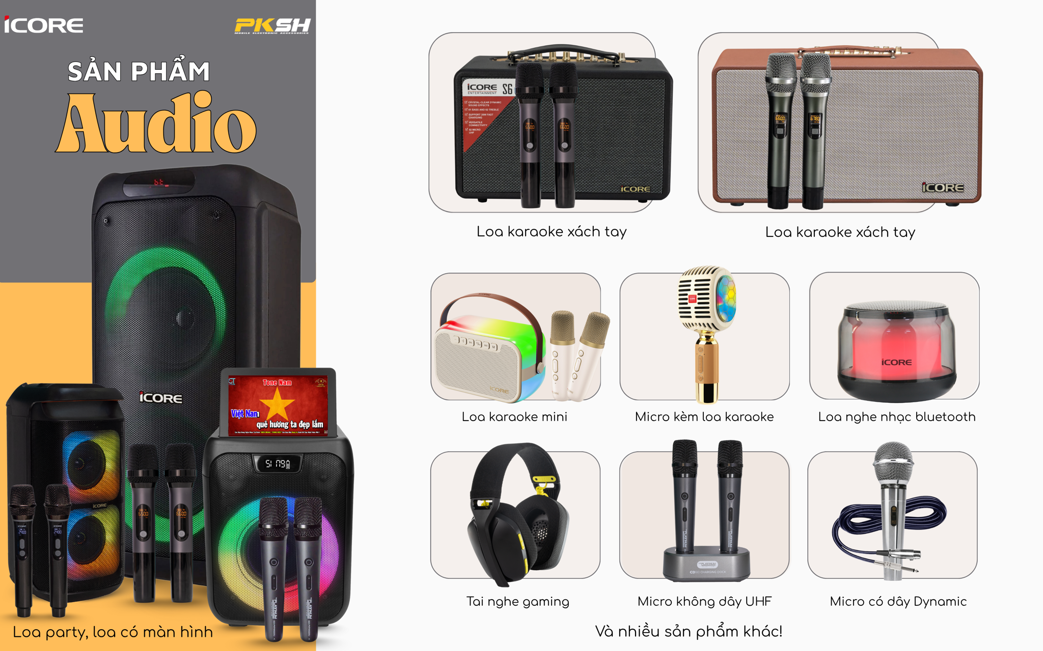 - iCORE - thương hiệu quen thuộc và được tin dùng tại Việt Nam, danh mục sản phẩm cực kỳ đa dạng với các nhóm: Audio - ICT - Sản phẩm tiện ích.